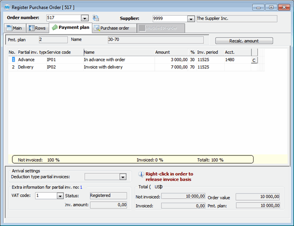 A new tab, Payment plan, is added if you choose (or have configured the supplier in the Update Supplier procedure) that the order shall be invoiced according to payment plan.