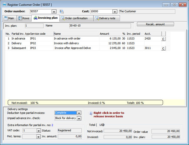 The Recalc.button is used if you want to update the invoicing plan, which might be useful e.g. when making additions in arrears to the order rows, so the order value becomes higher than the amount of the invoicing plan. The partial invoice amounts will then be redistributed. If a partial invoice has already been invoiced (or released) the row amount will not be changed, but the percentage rate will be changed.