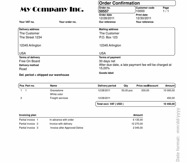 Sample of an order confirmation showing the invoicing plan below the order rows.
