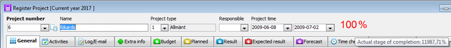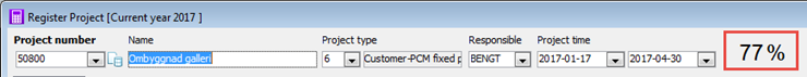 The stage of completion is shown in the project header according to the calculation basis selected for the project. The stage of completion is only shown in the interval 1 - 100%. If the calculation exceeds 100% or falls below 0%, this will be highlighted in red. If you place the cursor over the percentage, you will see actual calculation in a so-called tooltip.