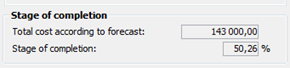Under the Result tab, the stage of completion is calculated based on actual costs in relation to forecasted costs. This will then be shown in the Stage of completion field.