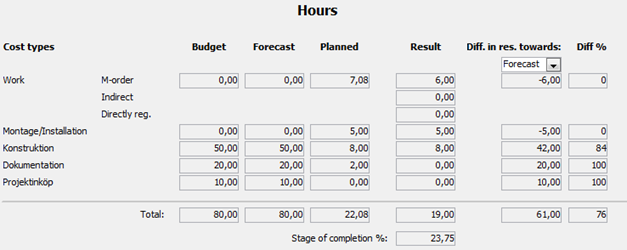 Under the Time check tab you will find columns for forecasted and planned hours. The stage of completion is calculated based on the actual hours in relation to the forecasted hours.