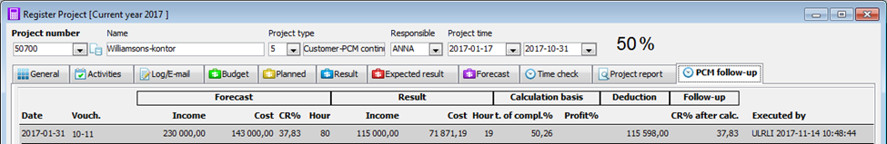 Under the PCM follow-up tab you will see a summary of all revenue calculations made for the current project. The ledger must be printed/reset. The summary shows the conditions on which the calculation was based at the time it was performed regarding forecast, result, stage of completion, profit in percent, total recognized income, and if the stage of completion was edited manually. Here you will see the voucher number as well as who performed the calculation and when it was made.