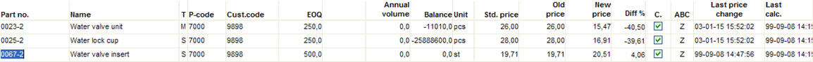 This list shows information for each part - before calculation - such as Name, Type, Part code, Links to customer codes, EOQ, Annual volume, Balance, Unit and Standard Price. The Old price and New price, as well as the difference between these (in %) are still set to zero.. The Calculation column (used to determine if it shall be included in the calculation or not). At the far right you will see the last price change date as well as the last calculation date.