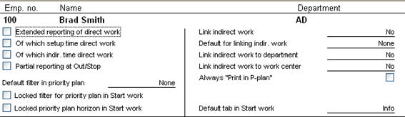 Here you will see the employee number, name and the department to which the employee belongs. In this list you can select different settings regarding how the work shall be reported and linked.