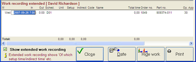 Check the box Show extended work recording to show extended information about work recording. This list shows information such as unit time and setup time separately.