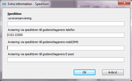 Här går det även att ange ett telefonnummer till godsmottagaren i fältet Avisering via speditören till godsmottagarens telefon, som speditören kan använda för att ringa när gods ska levereras. Telefonnumret kommer med vid utskrift av speditionsdokument, om informationskälla är Kundorder / leverans eller Följesedel.