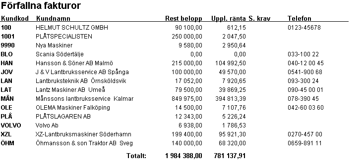 I denna lista visas uppgifter om kunden och samtliga uppgifter om de fakturor som finns förfallna för aktuell kund. Listan visar hur många dagar som gått efter förfallodagen och hur mycket ränta som uppstått. Till vänster om kolumnen Typ visas om det är en Förskottsfaktura (F), Leveransfaktura (L) eller Efterskottsfaktura (E).