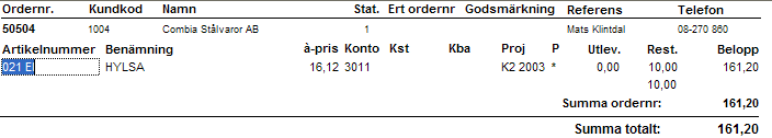 I lista Enbart summa visas det totala ordervärdet samt TB, TG, Säljare, Vår referens, Er referens, Godsmärke 1, Godsmärke 2, Orderdatum, Restantal, Antal orderrader, Tidigast leveransdatum och Projektnummer. I exemplet nedan är gruppering på Ordernummer. Vid gruppering på Följesedelsnummer kommer det även en ruta sist på raden som blir markerad om en EDI-plocklista är utskriven.