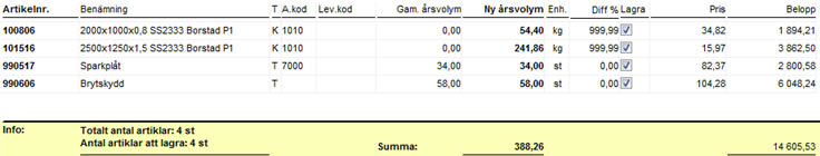Efter att Lista på bildskärm valts under Fönsterfunktioner vid fliken Beställning, visas en lista i ett mellansteg där ett urval av artiklar som uppfyllde sökkriteriet samt vilket värde på årsvolym som kommer att vara grund för beräkningen. I detta läge finns det möjlighet att avmarkera valda artiklar i kolumnen Ta med. Det går även att ändra värde i kolumnen Årsvolym innan körning startas. Längst till höger visas Belopp som är årsvolymen x priset. Längst ned visas en summering av årsvolym och belopp.