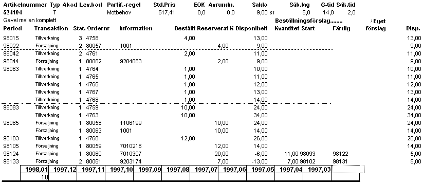 Hur utläses då informationen listan nedan? Tag t.ex. vid period 98105. Då ska kundorder 80059 levereras och har då reserverat 12 st. av denna artikel. En tillverkningsorder 4760 är lagd på 12 st. för att täcka denna beställning med färdigperiod 98103, eftersom säkerhetstiden är 2 arbetsdagar. Disponibelt lagersaldo blir då 26 st. Efter utleverans av kundordern sjunker disponibla lagersaldot till 14 st. Vid period 98124 ska kundorder 80060 levereras och reserverar 20 st. Det uppstår då en definitiv brist i lagersaldo på 6 st. Eftersom det inte finns någon tillverkningsorder som täcker denna kundorder, lägger systemet ett tillverkningsorderförslag på 11 st. med startperiod 98093 och färdigperiod 98122 för att täcka bristen plus säkerhetslager (14-20+11=5). Om tillverkningsorder genereras utifrån förslaget blir disponibla lagersaldot efter utleverans av kundordern lika med säkerhetslager, vilket kan utläsas längst till höger i listan.