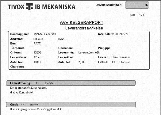 Här visas ett exempel på dokumentet Avvikelserapport. Detta dokument finns med på alla avvikelsetyper. Under rubriken står vilken typ det gäller för, i det här fallet en kundavvikelse.