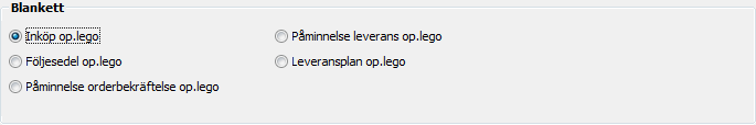 Tillverkning omfattar blanketterna Inköp op.lego, Följedel op.lego, Påminnelse orderbekräftelse op.lego, Påminnelse leverans op.lego samt Leveransplan op.lego.