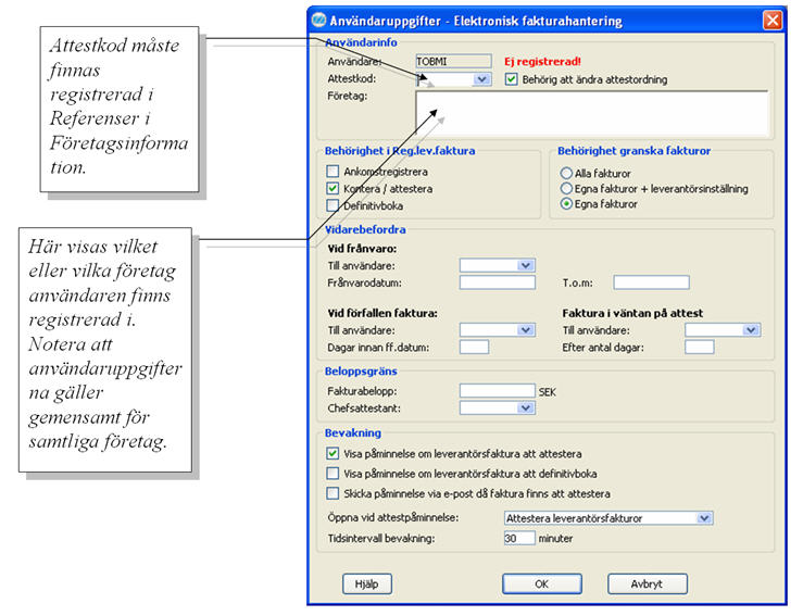 Fönstret Användaruppgifter - Elektronisk fakturahantering.
