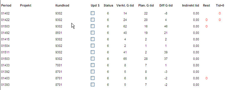 Till höger i listan visas period, projekt, kundkod och under Upd S finns möjlighet att markera/avmarkera vilka order som ska få status uppdaterad till 5 (Efterkalkylerad).
