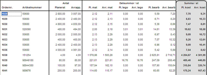 Listan visar alla färdiga operationer som är ligger inom de selekteringar som gjorts på fliken Beställning. Legooperationer och legokostnader visas inte i denna lista och materialkostnaderna innehåller endast de K-artiklar som är kopplade till motsvarande operation. Däremot går det i fliken Beställning välja att istället visa Enbart legogrupper för att bara se legooperationer och legokostnader i listan.