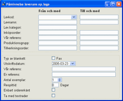Här går det även att ange om blankett för fax ska användas, utskriftsdatum, vår referens, er referens, antal exemplar att skriva ut, respittid, enbart ordererkänt och om textrader ska tas med.