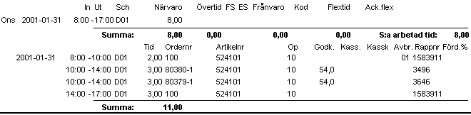Tis 01-01-23 Normal in- och utstämpling utan övertid: Både in och utstämping har gjorts utanför ordinarie arbetstid men övertid har inte registrerats. Tiden för stämplade arbeten registreras endast för ordinarie arbetstid, vilket skapar en differens mellan närvarotid och tid för arbeten.