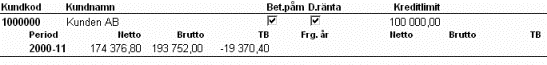 Lista Limitkontroll visar för varje kund kreditlimit, orderstock, kundfordringar och differens mellan kreditlimit minus orderstock och kundfordringar. Kreditlimit går att uppdatera.
