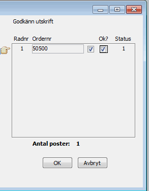 I den högra delen går det nu om det behövs, att välja bort order som utskriften ej ska godkännas för. Detta kan uppstå för vissa order, t.ex. om det blev slut på papper i skrivaren mitt under utskriften. Avmarkera då dessa order under Ok? Ska hela utskriften makuleras, klicka på Avbryt.