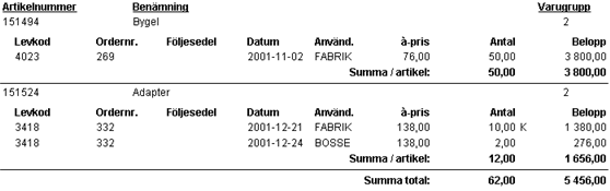 Exempel på lista Logg, grupperad på Artikelnummer.