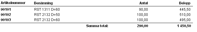 Exempel på lista Enbart summa, grupperad på Artikelnummer.