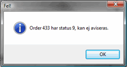 Det finns även en kontroll som gör att det inte går att avisera på en redan slutlevererad order (som har status 9). Då visas ett meddelande att ordern har status 9 och inte kan aviseras.