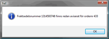 I systemet finns en funktion som kontrollerar att samma xml-fil innehållande avisering inte kan importeras igen, om aviseringen ifråga redan finns sparad på ordern. Om aviseringen finns sparad visas ett meddelande om att fraktsedelnumret redan finns aviserat för ordern.