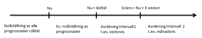 Först nollställs systemets alla prognosrader som ligger i dåtid. Med parametern "Nollställ prognos fram till" kan prognosrader som ligger inom artikelns ledtid (generell ledtid under planeringsinfo, fliken Planering i Uppdatering artiklar) också nollställas. Därefter avräknas kvarvarande försäljningsprognosrader enligt följande: Ny försäljningsprognos = Ursprunglig försäljningsprognos - kundorder.