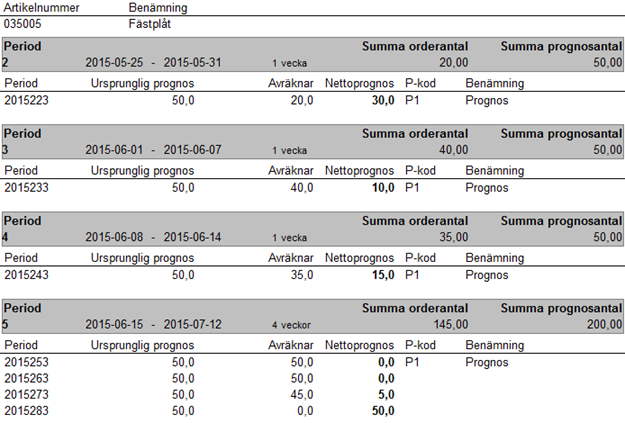 Här visas exempel och förklaringar av listorna i rutin Avräkning försäljningsprognos.