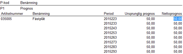 I listtyp Lista går det att se och uppdatera kolumnerna Ursprunglig prognos och Nettoprognos för varje period i befintliga försäljningsprognoser. Ändringar verkställs med Spara.
