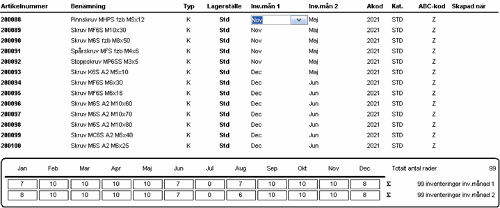 I listan visas artikelnummer, benämning, artikeltyp, lagerställe, inventeringsmånad 1 och 2, artikelkod, kategori, ABC-kod samt datum när artikeln är skapad. Vid behov går det att manuellt ändra datum för varje artikel i kolumnerna Inv.mån 1 och Inv.mån 2.