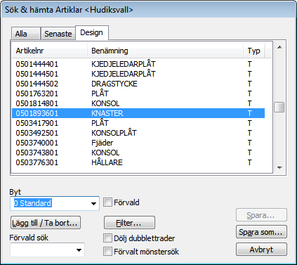 Under fliken Design kan du skapa en egen layout av Sök & hämta, med utgångspunkt från standard Sök & hämta. Du skapar en egen Sök & hämta per fält, t.ex. fältet Artikelnr i en rutin. Din egen Sök & hämta blir valbar i fältet Byt som sedan visas i fliken Alla i det aktuella fält där du skapade den. Du kan även skapa flera egna Sök & hämta per fält.