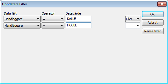 Du kan lägga in filter i din egen Sök & hämta. Du lägger in filter med olika villkor på datafält för att filtrera fram enbart de poster som uppfyller dina villkor. Du kan lägga in filter på alla tillgängliga datafält och inte bara på datafälten för de kolumner du valt att visa.