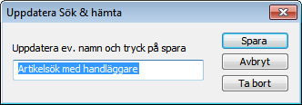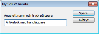 Här sparar du en ny egen Sök & hämta. Du kan även ange ett beskrivande namn innan du sparar. Du får ange ett namn för din Sök & hämta. Alla Sök & hämta som skapas får ett löpnummer. Detta nummer visas i fältet Byt.