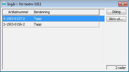 Det går att se om en befintlig textfras används på andra poster. Genom att klicka på knappen Ingår i... visas ett fönster med de poster där denna textfras är kopplad.