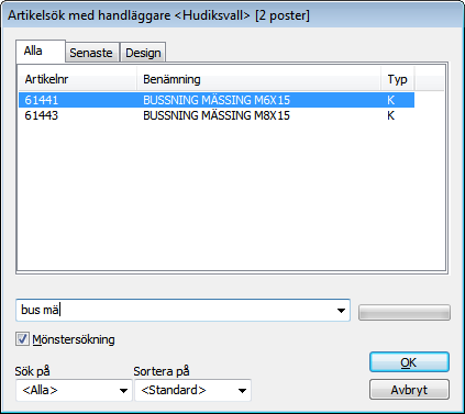 Det är möjligt att göra "mönstersökning" på tecken och fraser i de kolumner som visas i Sök & hämta fönstret. Det går även att mönstersöka på numeriska värden. Markeras Mönstersökning i fliken Alla, förbereds Sök & hämta för mönstersökning.