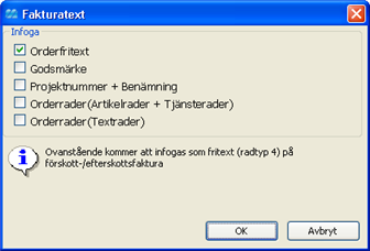 Den information som går att infoga som fakturatext är: Orderfritext, Godsmärke, Projektnummer + Benämning, Orderrader av radtyp 1-3 (artikel- och tjänsterader) samt Orderrader av radtyp 4 (fritextrader). I fönstret går det att kombinera flera av valen.