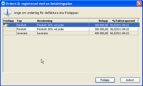 Om så är fallet sker en kontroll om det finns delfakturor för förskott/efterskott som ännu ej frisläppts och en ruta visas där du kan välja om du vill frisläppa underlag för förskottsfaktura eller efterskottsfaktura: