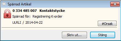 Om en artikel, kund eller leverantör är spärrad dyker det upp ett Closedinformationsfönster som upplyser om detta om en t.ex. en order försöker registreras. I det fönstret går det välja att se orsaken till spärren, om en sådan angivits.