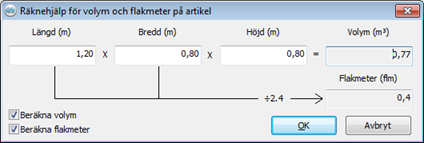 Räknehjälp för volym och flakmeter på artikel öppnas med knappen
