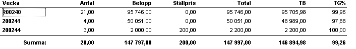 I lista Summera / vecka visas radvis per kund och vecka: Antal fakturerat, Belopp, Ställpris, Total (Belopp plus Ställpris), TB samt en beräkning av TG för veckan.