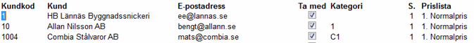 Listan visar information på varje kund med kolumner för Kundkod, Kundnamn, E-postadress (Huvudadress alternativt adress direkt till referensperson), Ta med, Kategori (Kundkategori), S (Kundstatus) och Prislista.