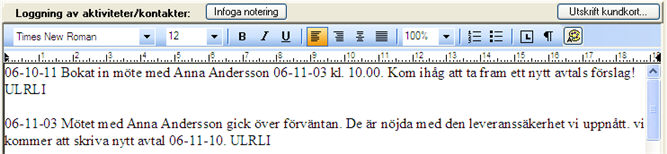 Under rubriken Loggning av aktiviteter/kontakter, finns möjligheter att skriva noteringar kring aktiviteter, händelser och andra anteckningar som rör kunden/kontakten. Noteringar kan gälla båda planerade aktiviteter och aktiviteter som är genomförda.