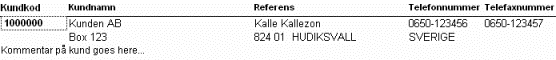 I lista Standard visas för varje kundkod, kundnamn, referens, telefon och telefax. På den undre raden går det ändra på gata/box, postadress och land.