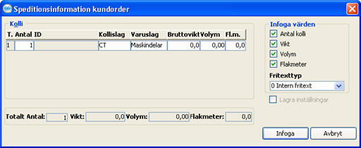 - 0 (Intern fritext) - fritextraden visas bara i orderbilden och skrivs inte ut på några dokument.