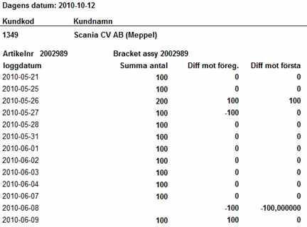 Lista Summa per datum/artikel visar överst dagens datum (då listan togs fram). Sedan visas per Kundkod och Artikelnummer: Summa antal per Loggdatum (importdatum), Differens mot föregående import samt Differens mot första import, på alla orderrader i importerade leveransplaner.