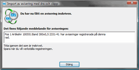 Om restantal är noll på en orderrad som aviseras, detta uppstår ifall orderraden är helt inlevererad före aviseringen, då visas information om det i resultatfönstret och aviseringen på orderraden importeras inte.