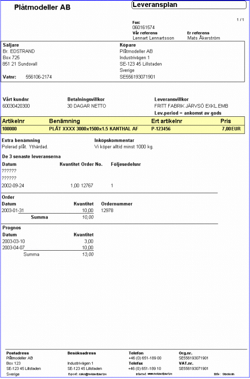 Nedan visas ett exempel på hur blanketten Leveransplan ser ut. Vid artikelvis utskrift skapas en leveransplan per artikel medan utskrift sorterat på artikel ger flera artiklar per leveransplan.