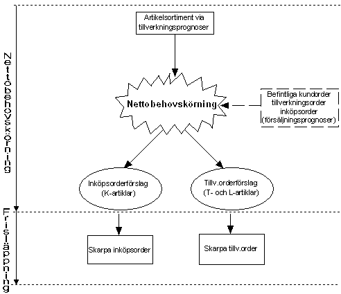 Nettobehovskörning tillverkningsprognos gör sedan följande steg automatiskt (se även flödesschemat nedan):